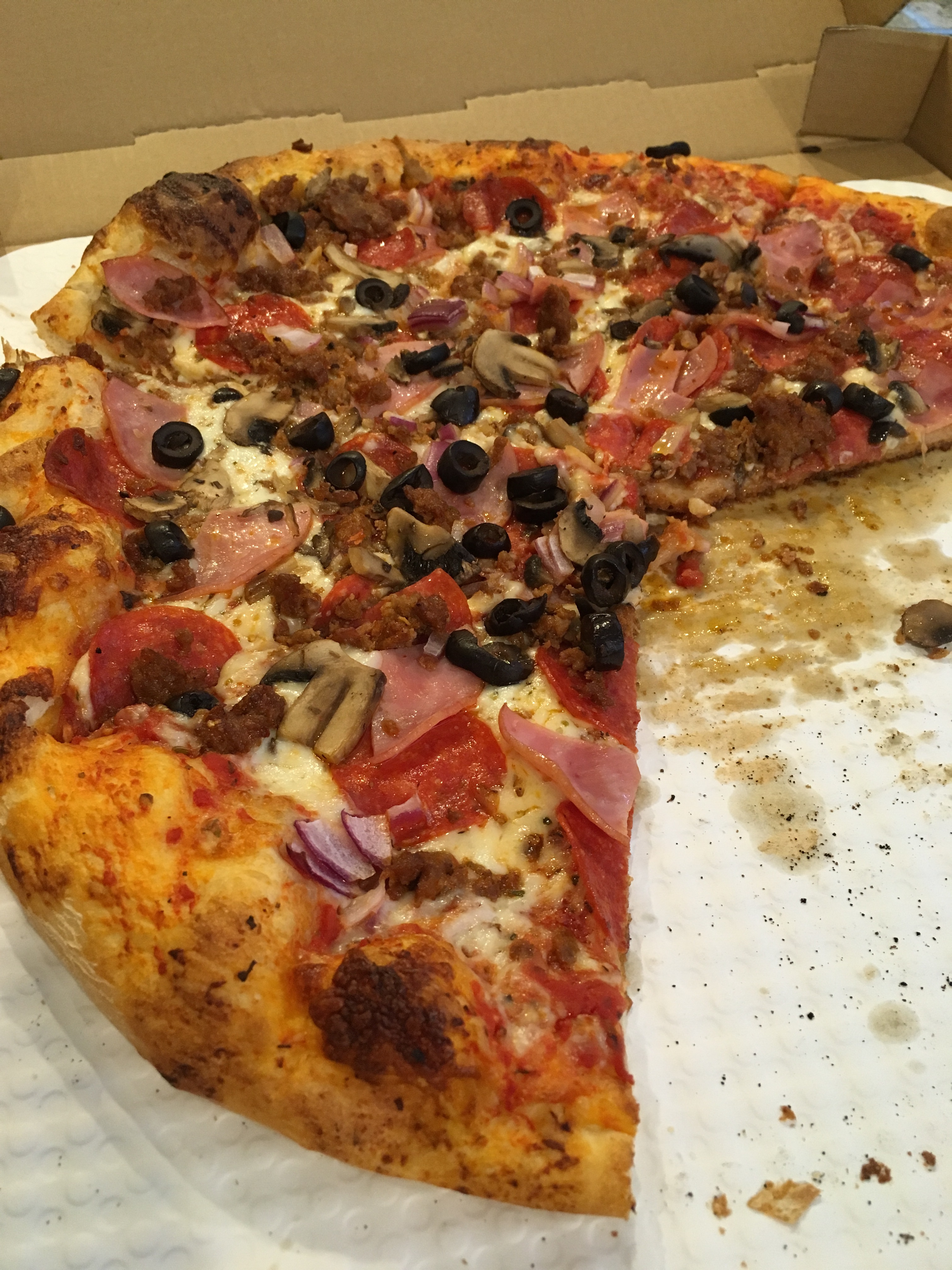 [Note most of my pictures are taken mid-consumption owing to manbearpig-like pizza craving. Also not shown: children strewn about the floor as I toss them to the side whilst devouring pizza.]